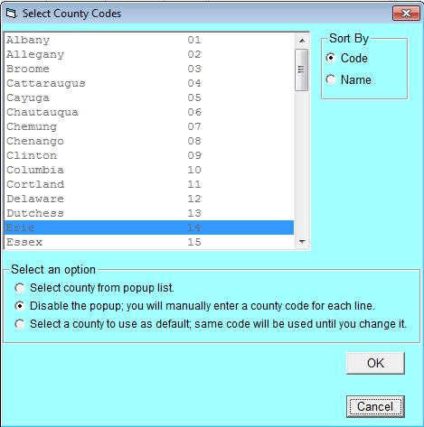 - Select from List: This mode enables the county code popup. Simply click the appropriate county with your mouse and the county code will be filled in on the form. The pop-up will appear every time you enter the county code field on forms 26 or 27.