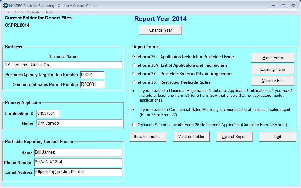 Use the Control Center to tell us who to contact when we communicate with you about your report. Please fill out all three fields under Pesticide Reporting Contact Person. You also need to provide identification information, so that we can associate your report with the correct applicator(s) or organization.