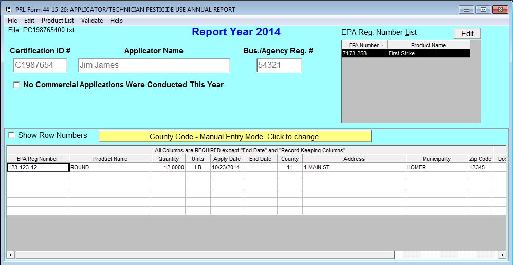 If you have multiple applicators to include on your report, we recommend using Form 26A to submit their information. The pesticide applications they made should be entered on a single Form 26. Choose one of the applicators to list in the header area of the Form 26. If any applicators that you are reporting for made any applications during the report year, you should submit Form 26.