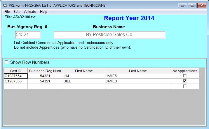 Cells are validated as you move the insertion point to the next cell. While it is possible to save and submit your files without correcting validation errors, the Pesticide Reporting Service Bureau may reject or return reports because of invalid data.