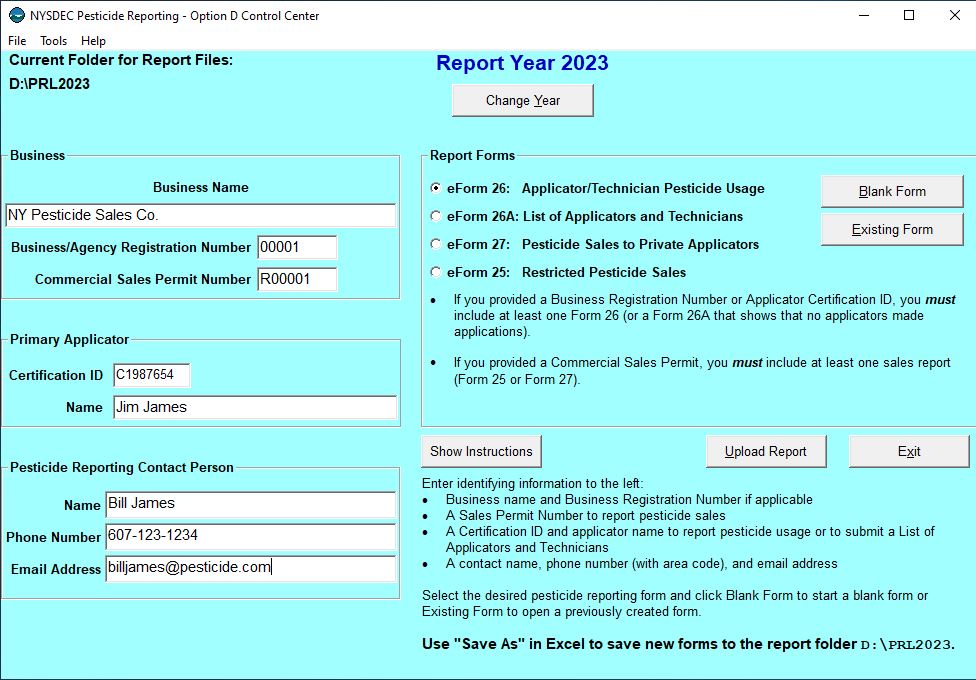 Use the Control Center to tell us who to contact when we communicate with you about your report. Please fill out all three fields under Pesticide Reporting Contact Person. You also need to provide identification information, so that we can associate your report with the correct applicator(s) or organization.